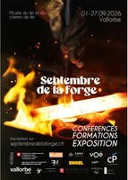 ...Le Septembre de la Forge est un événement d’un mois à Vallorbe dédié à la découverte et à la transmission des savoir-faire liés au travail du métal. À travers des formations, conférences et expositions, il offre au public – débutants comme professionnels – l’opportunité d’explorer la forge de l’intérieur, de comprendre ses techniques et ses enjeux actuels, et de rencontrer celles et ceux qui font vivre ce métier d’art. L’événement s’inscrit également dans une démarche de développement d’un futur centre national du Fer.